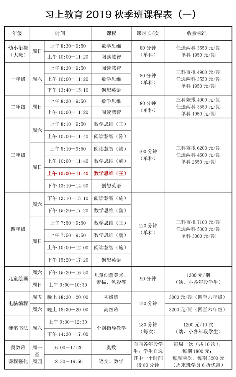 三四年级由于数学课将分层教育,课表上标出授课老师,三年级王老师周六班的课程最难,周日班的次之,魏老师的相对简单。四年级王老师周日班最难、魏老师周六班次之、魏老师周日班相对简单。