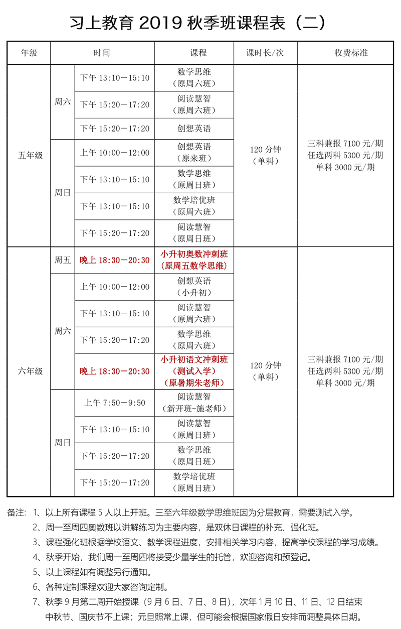 秋季新开设一个六年级小升初语文冲刺班(红色标识),由去年暑假广受好评的朱老师授课,针对基础较好的孩子,需要测试入学。
